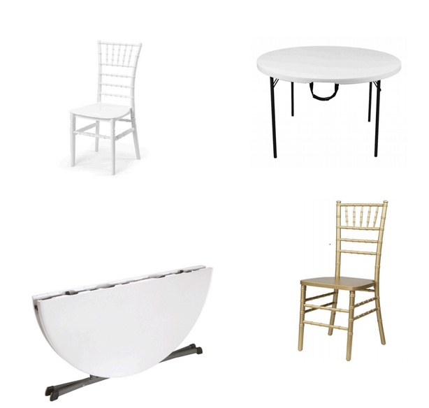 Sillas dorada o blanca = 2,50€ / unidad. Mesa = 6€/ unidad