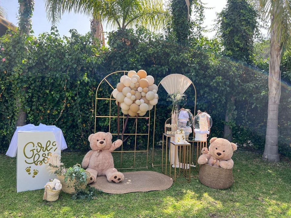 Juego de arcos con tela más juego de mesas más osos con alfombras