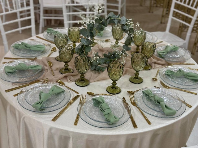 Mesa con sillas, mantelería, servilletas, camino de mesa, copa y vaso, platos y cubiertos, centro de mesas, candelabros o aros con eucalipto