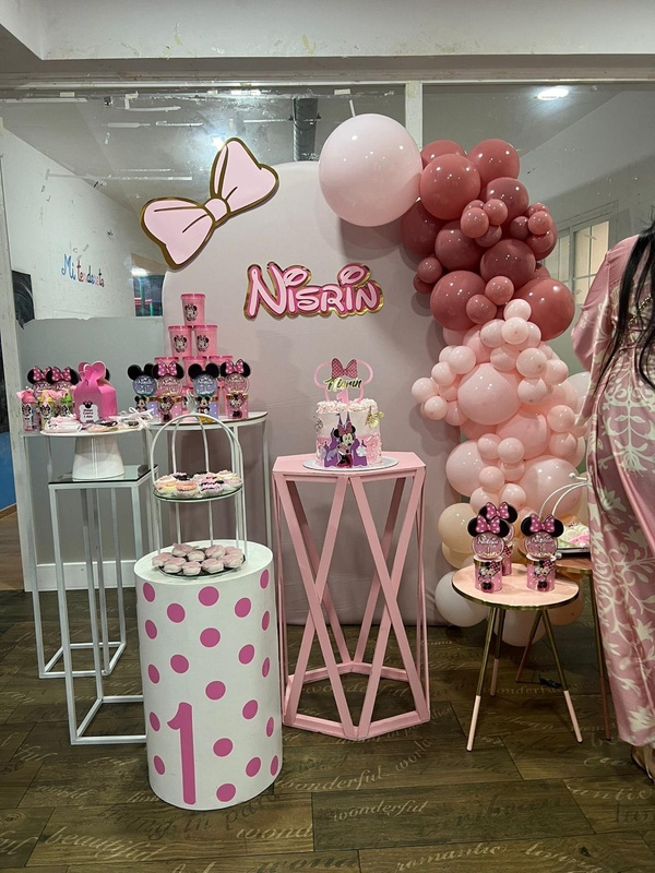Panel personalizado+ juego de mesas + expositores + neón Happy