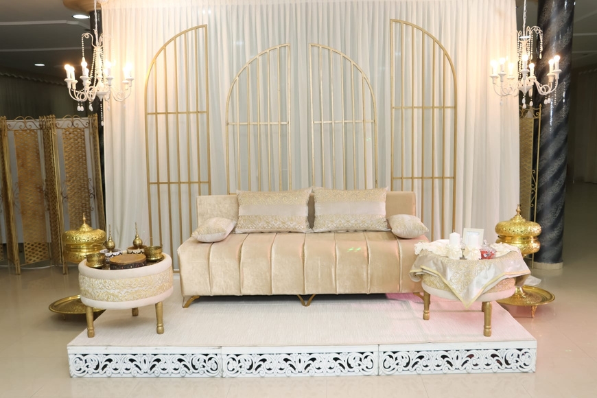 Escenario + sillón + decorado de fondo + alfombras + mbajrat