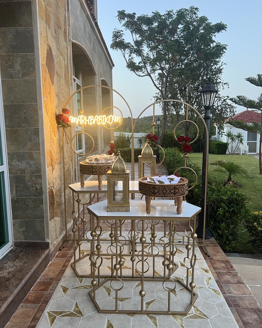 Juego arcos de borlas dorados con juego de mesas y expositor y neón marhbabikom